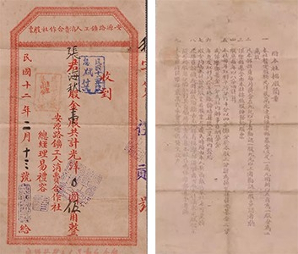 江西萍鄉(xiāng)煤礦自1898年開辦起,安源工人便在經(jīng)濟(jì)上深受剝削,礦局拖欠工資,奸商哄抬物價(jià)。為了維護(hù)工人利益,減少商人的中間盤剝,1922年5月中國(guó)共產(chǎn)黨領(lǐng)導(dǎo)的安源路礦工人俱樂部成立不久,便于同年7月創(chuàng)辦了中國(guó)工人階級(jí)最早的經(jīng)濟(jì)組織——安源路礦工人消費(fèi)合作社。隨著規(guī)模和經(jīng)營(yíng)范圍進(jìn)一步擴(kuò)大,消費(fèi)合作社流轉(zhuǎn)資金嚴(yán)重不足,出現(xiàn)了貨品短缺的窘境。為了解決資金不足的問題,1923年初,消費(fèi)合作社決定在俱樂部部員中招股,制定了《招股簡(jiǎn)章》。工人們深信消費(fèi)合作社就是為大家謀利益的經(jīng)濟(jì)實(shí)體,盡管十分困難,仍踴躍認(rèn)購(gòu)股票,很快就籌集到股金7800余元,連同俱樂部撥來(lái)的活動(dòng)經(jīng)費(fèi)一起,共計(jì)資金1.8萬(wàn)余元。消費(fèi)合作社給每位認(rèn)股者發(fā)了自行設(shè)計(jì)的股票作為憑證。