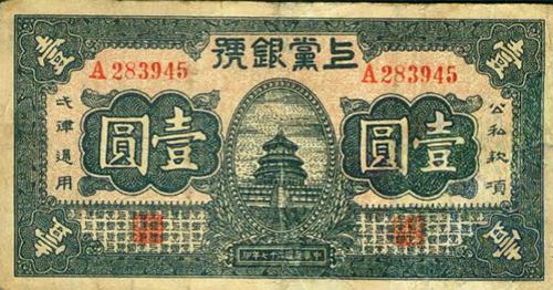 1938年,為了獨立自主地發展和鞏固根據地,嚴防蔣介石、閻錫山經濟封鎖,晉東南抗日根據地在沁縣成立上黨銀號,發行“上黨票”。上黨票初發行時與法幣、晉鈔、銀元以及根據地各縣銀號發行的縣票同時流通于晉東南、晉南、晉中、冀南等部分縣域,1938年發行的面額有拾元、伍元、貳元、壹元、伍角、貳角伍分、貳角、壹角等8種票面10種版別。壹元票的主圖設計為體現根據地貨幣特色,天壇主圖的下面倒印有一“黨”字暗記。1940年初,“上黨銀號”結束,其財產并入“冀南銀行”時,共發行上黨票300余萬元。