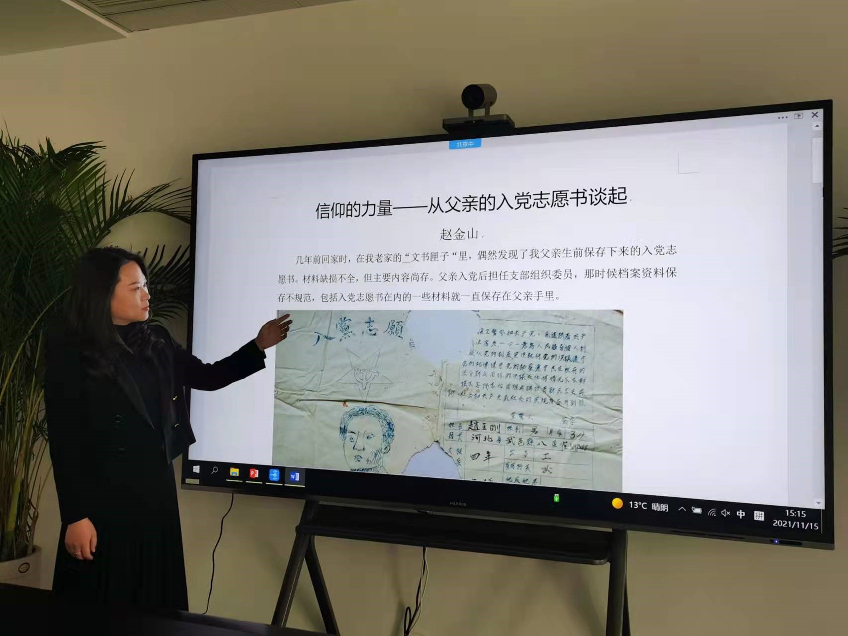 大家還研讀了趙金山同志的文章《信仰的力量——從父親的入黨志愿書談起》,在文中我們看到了趙金山同志的父親趙玉剛同志的《入黨志愿書》,這份《入黨志愿書》由中共冀南武邑縣委組織部印制,歷經(jīng) 60 多年歲月,雖已殘破,但圖案和字跡依然清晰,是非常寶貴的文獻資料。在了解了這份《入黨志愿書》的故事和趙玉剛同志的生平事跡后,大家被這種信仰堅定、忘我奉獻、吃苦在前、享受在后的精神所打動,表示一定要繼承老一輩共產(chǎn)黨員的光榮傳統(tǒng),在公司戰(zhàn)略轉型的關鍵時期勇挑重擔,踐行使命-----這是我們每個共產(chǎn)黨員的責任。